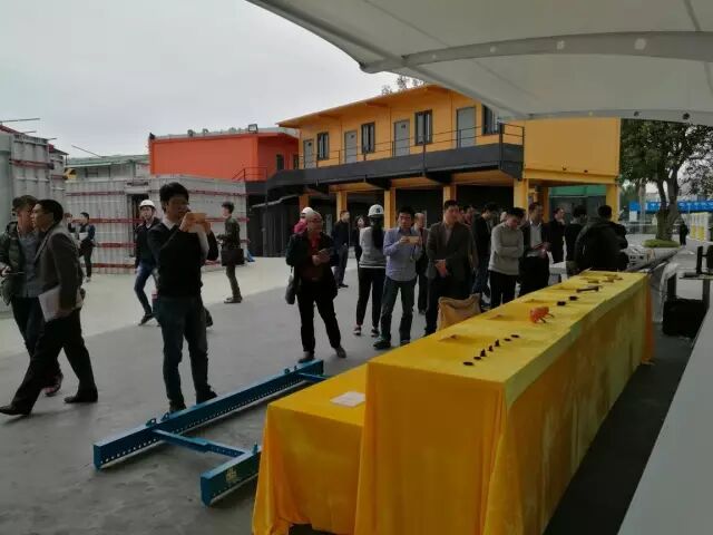 此次参加观摩的学员共计120余人,现场观摩共分为三组,各组人员由项目经理、项目总工以及项目副总工引导讲解,依次参观了项目办公区临建、展棚区及施工现场三个观摩区域。学员们在专业人员的带领下参观了装配式建筑全过程需要的关键工具及器材、预制构件样板房及铝模样板间,项目人员向学员展示了项目3D打印模型,另外项目BIM专员向大家介绍了项目BIM实施情况,并引导学员代表体验了项目的VR模型,让大家对预制构件的吊装有个更直观的认识。学员对预制构件拼装的样板间兴趣浓厚,并与现场讲解员探讨了样板间预制构件的安装流程及细节处理。